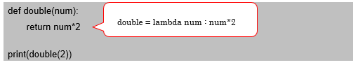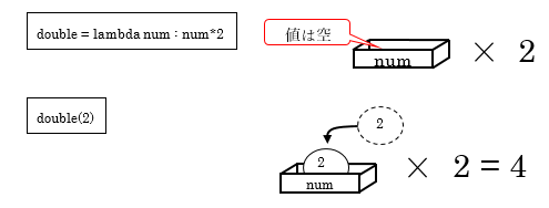 [python] double = lambda num : num*2 print(double(2) [/python]実行結果